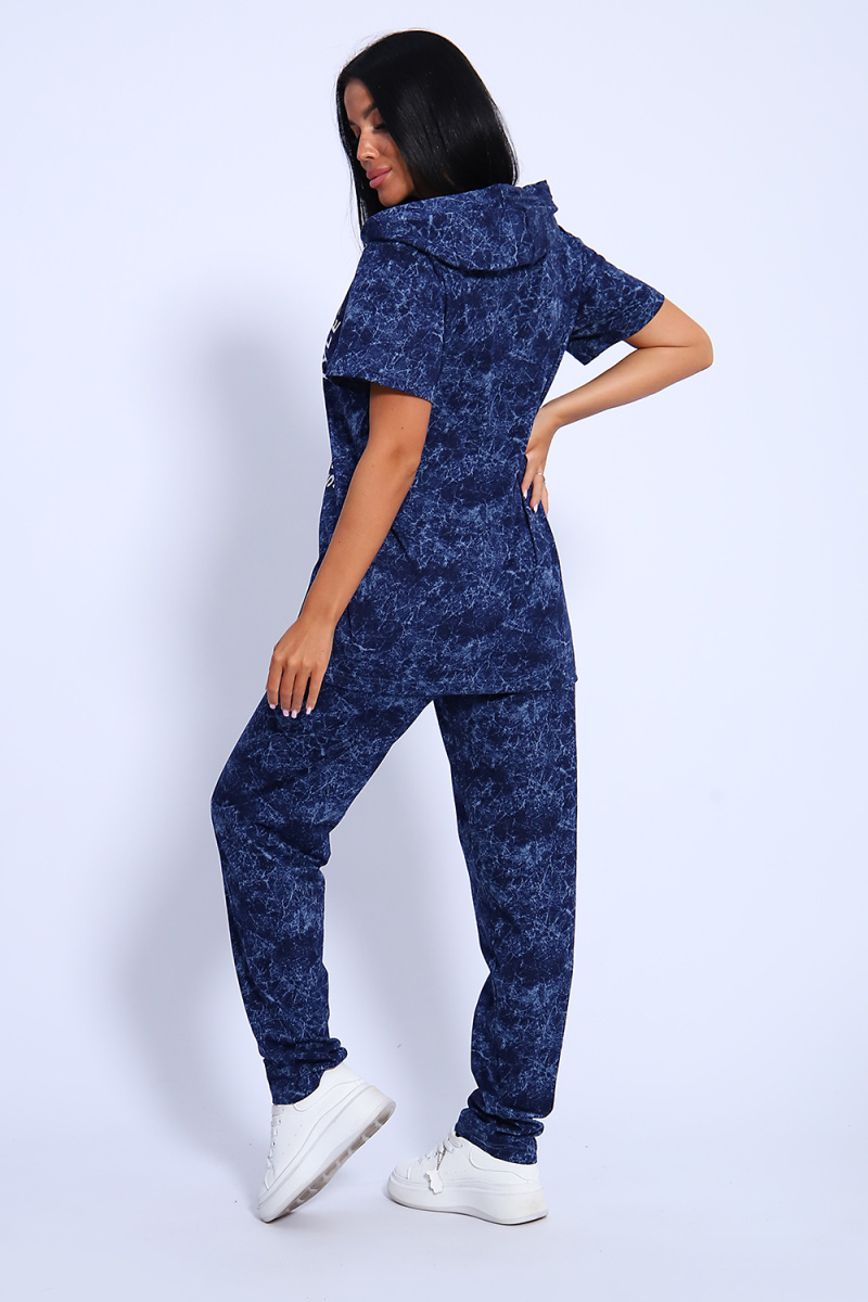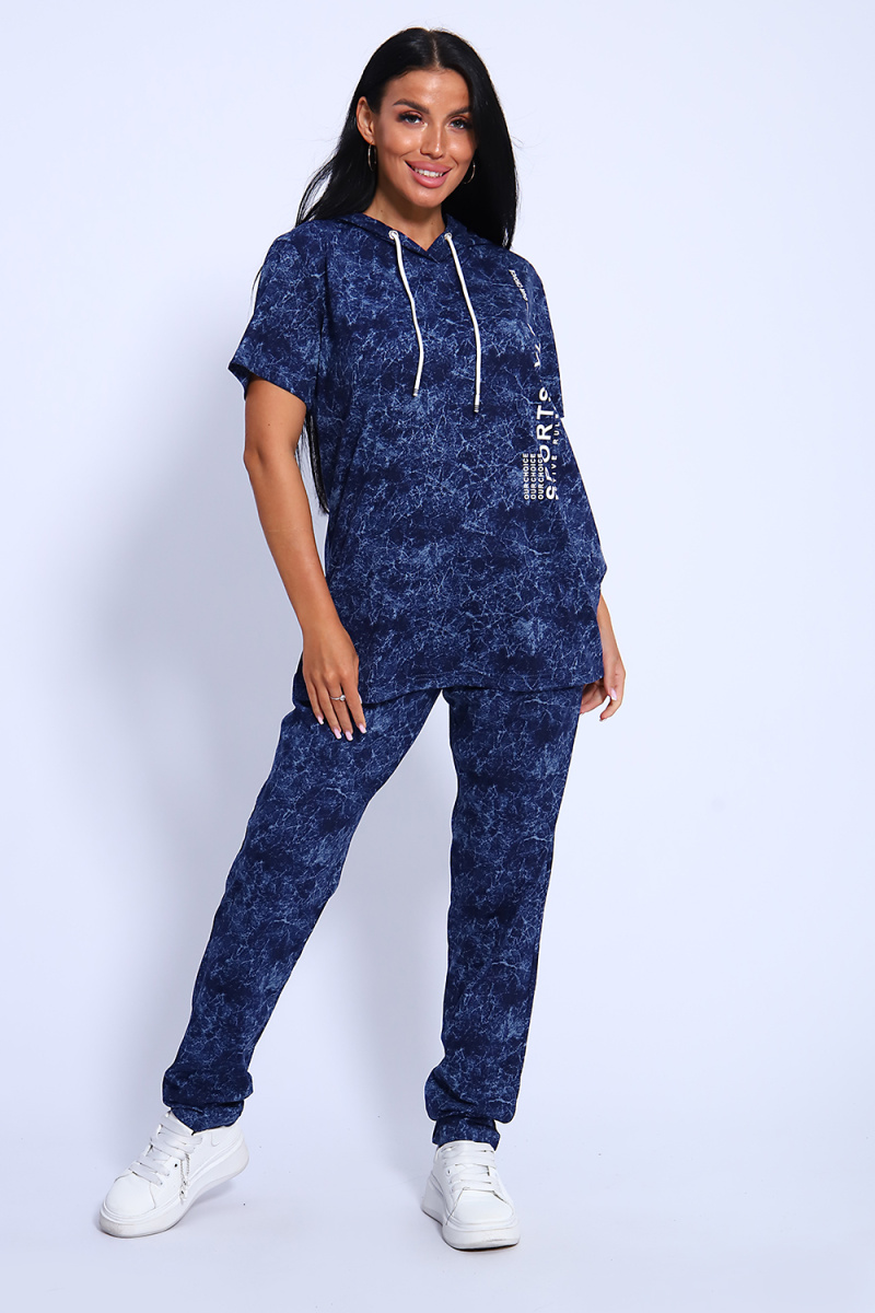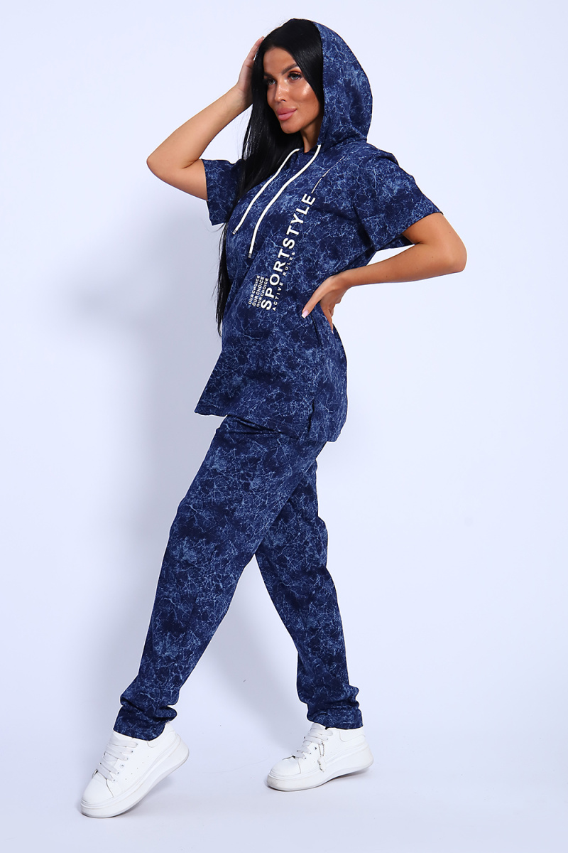 Яркий и стильный женский костюм из легкого дышащего трикотажного полотна высокого качества. Изюминкой костюма является рисунок ткани, имитирующий "вареную" джинсовку. для удобства модниц изделие представлено в 4-х ярких расцветках. На кофте имеется капюшон, объем которого регулируется тонкой лентой. Этот универсальный и практичный повседневный костюм в спортивном стиле будет удобным и комфортным во многих ситуациях. Комплект отлично подойдет для спорта, бега или танцев. Брюки свободные, с двумя боковыми карманами, на широком поясе с резинкой. Каждую вещь вполне можно использовать по отдельности. Комплект отлично подойдет для женщин любого возраста и поможет хозяйке выглядеть стильно, при этом даря чувство комфорта!