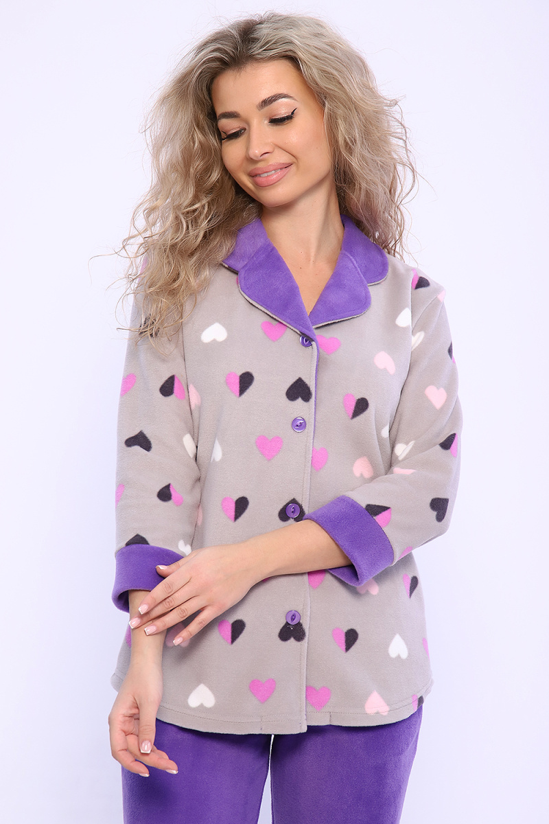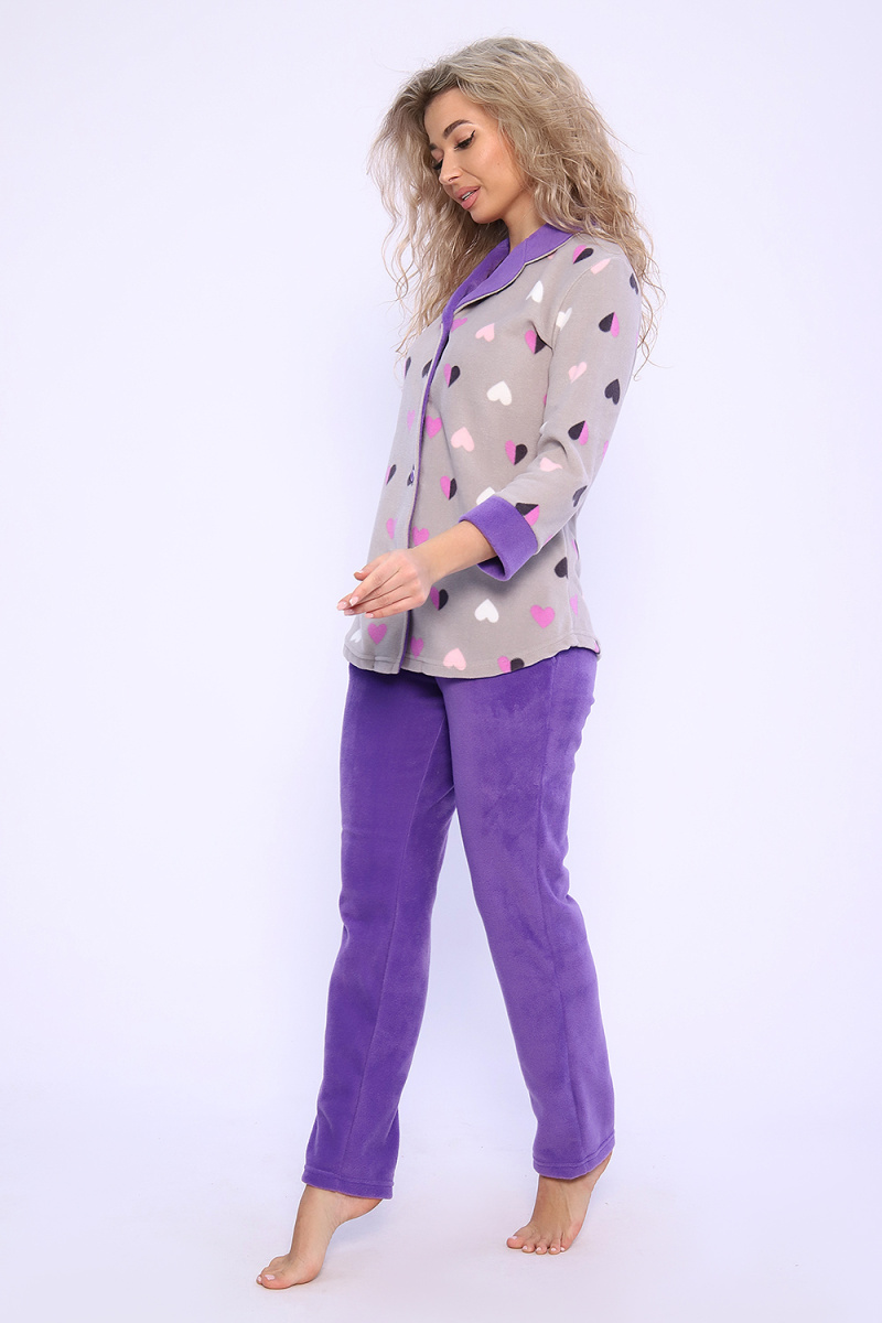 Домашний женский костюм из мягкого, теплого флиса. Кофта полуприлегающего силуэта, застегивается на петли и пуговицы. Длиной до бедер с фигурной линией низа. Рукав втачной, длиной 3/4 с манжетом из отделочной ткани. Воротник пиджачного типа с закругленными углами, из отделочной ткани. Борта, воротник и лацканы отстрочены. Домашние брюки прямого кроя с вместительными карманами в боковом шве, комфортный пояс на резинке, располагается на линии талии, длина брюк ниже щиколотки.