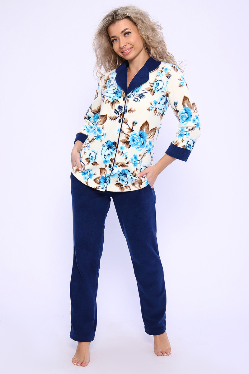 Домашний женский костюм из мягкого, теплого флиса. Кофта полуприлегающего силуэта, застегивается на петли и пуговицы. Длиной до бедер с фигурной линией низа. Рукав втачной, длиной 3/4 с манжетом из отделочной ткани. Воротник пиджачного типа с закругленными углами, из отделочной ткани. Борта, воротник и лацканы отстрочены. Домашние брюки прямого кроя с вместительными карманами в боковом шве, комфортный пояс на резинке, располагается на линии талии, длина брюк ниже щиколотки.
