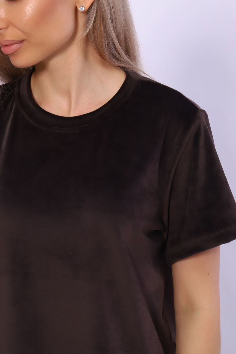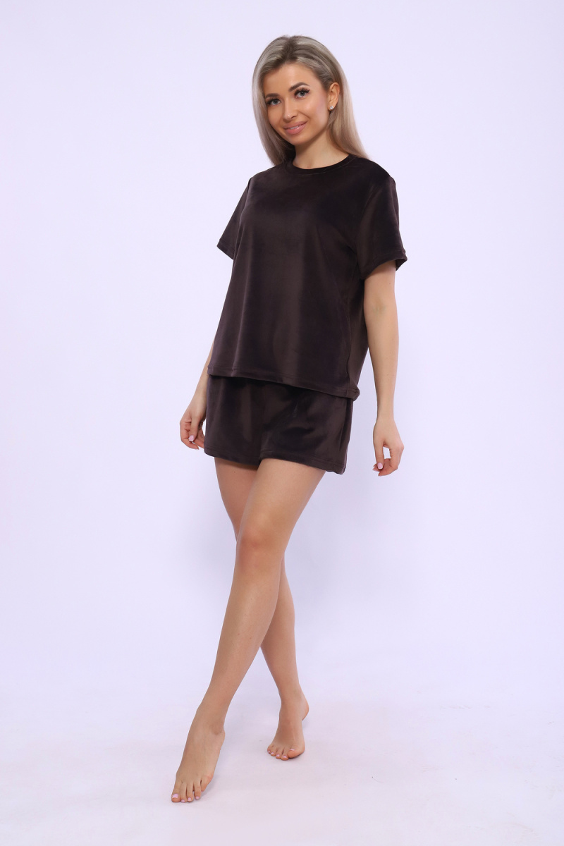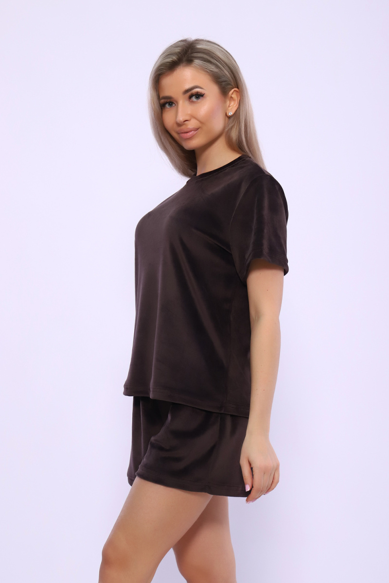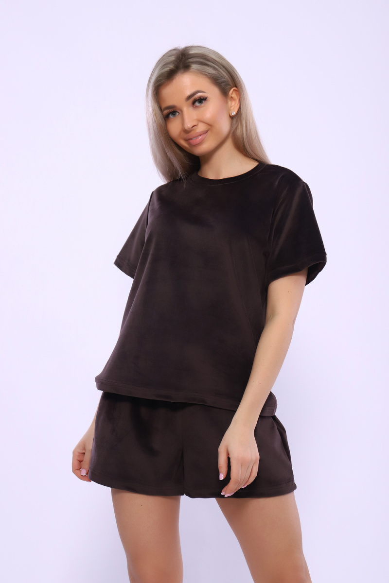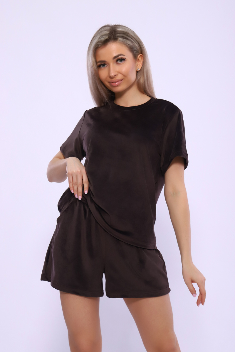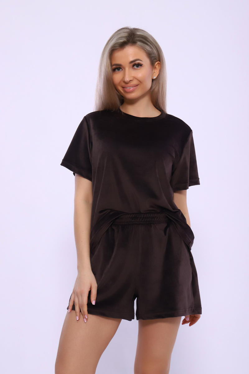 Костюм повседневный с шортами из мягкого велюра. В комплект входят: футболка с коротким рукавом с округлым вырезом горловины и шорты с карманами и поясом на резинке. Удобный велюровый костюм имеет свободный покрой, что делает его универсальной одеждой, которая подойдет на любую фигуру. Он не сковывает движения, скрывает недостатки и подчеркивает достоинства фигуры. Удобные шорты имеют комфортную посадку, резинка не давит, не скручивается, не перетягивает талию. Костюм универсальный, его приятно носить дома и на улице.