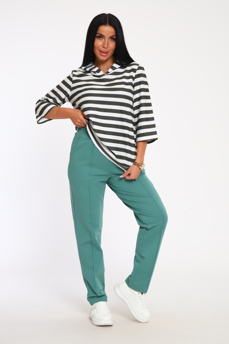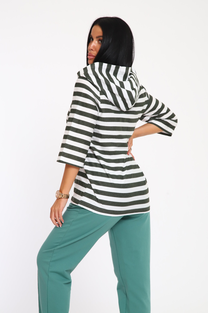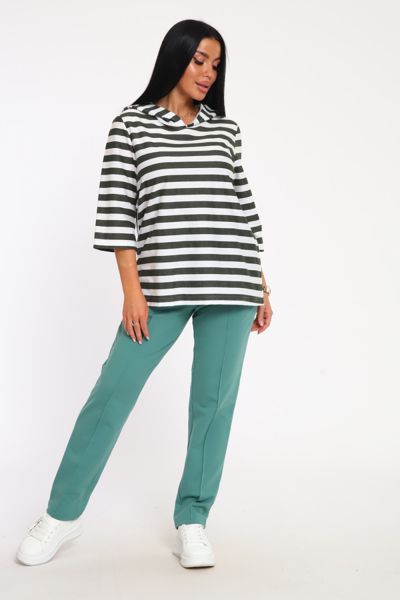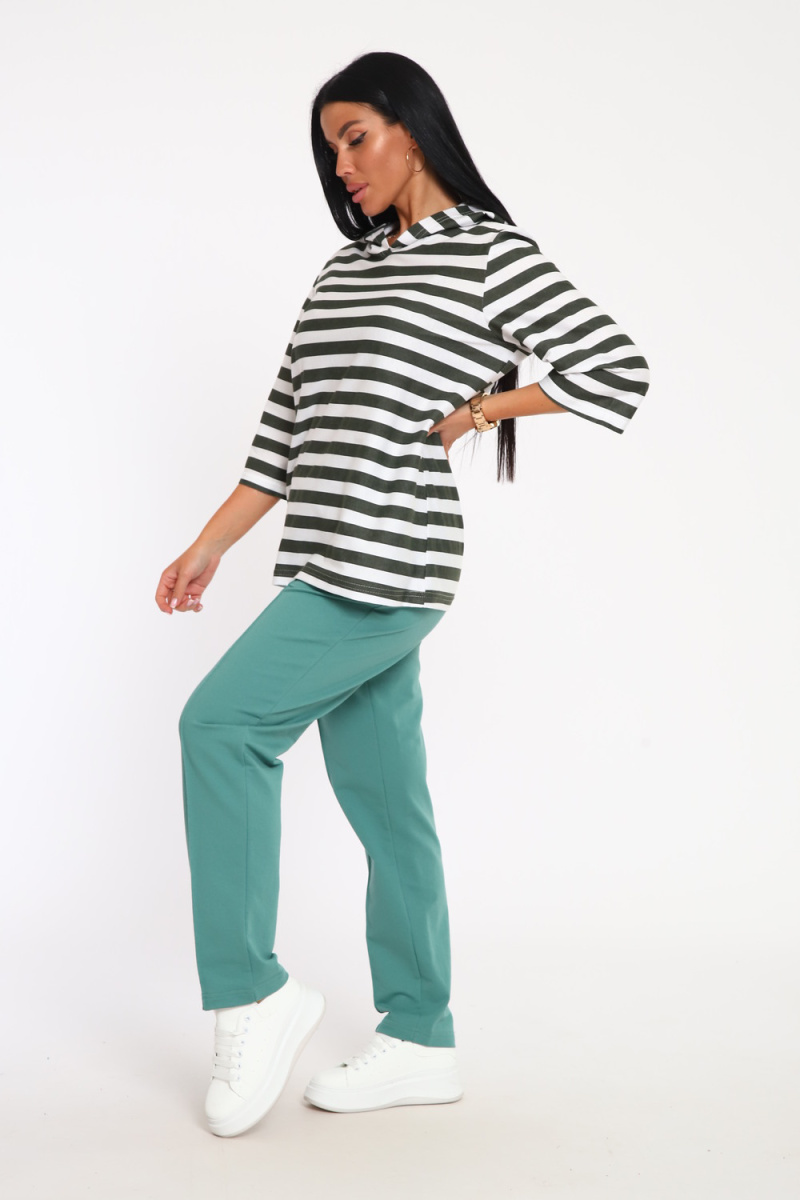 Представляем Вашему вниманию современный костюм, состоящий из брюк и футболки с капюшоном. Футболка в полоску –это модный тренд уже несколько сезонов подряд Футболки с капюшоном-универсальная вещь, которая обязательно должна присутствовать в гардеробе любой девушки и женщины. В сочетании с такой футболкой можно наработать огромное количество образов, как на каждый день ,так и для различных мероприятий. Обожающие эксперименты девушки и женщины могут сочетать футболку с классическими брюками, чтобы соответствовать экстравагантному стилю спортшик. Наша модель брюк с отстроченной стрелкой спереди, двумя боковыми карманами, поясом на резинке отлично подходит для этого. Добавить к стильному луку можно туфли на высоком каблуке или стильные ботинки на толстой подошве .Женщина будет выглядеть независимо и очень модно. Наряд можно дополнить яркими аксессуарами и образ уже подойдет для выхода в люди. Футболка выполнена из 100%хлопка.В ней будет комфортно в любую погоду .Брюки выполнены из трикотажного полотна .которое