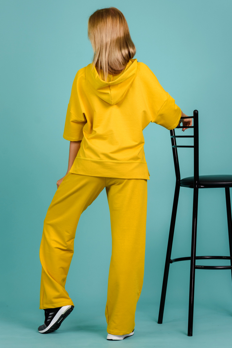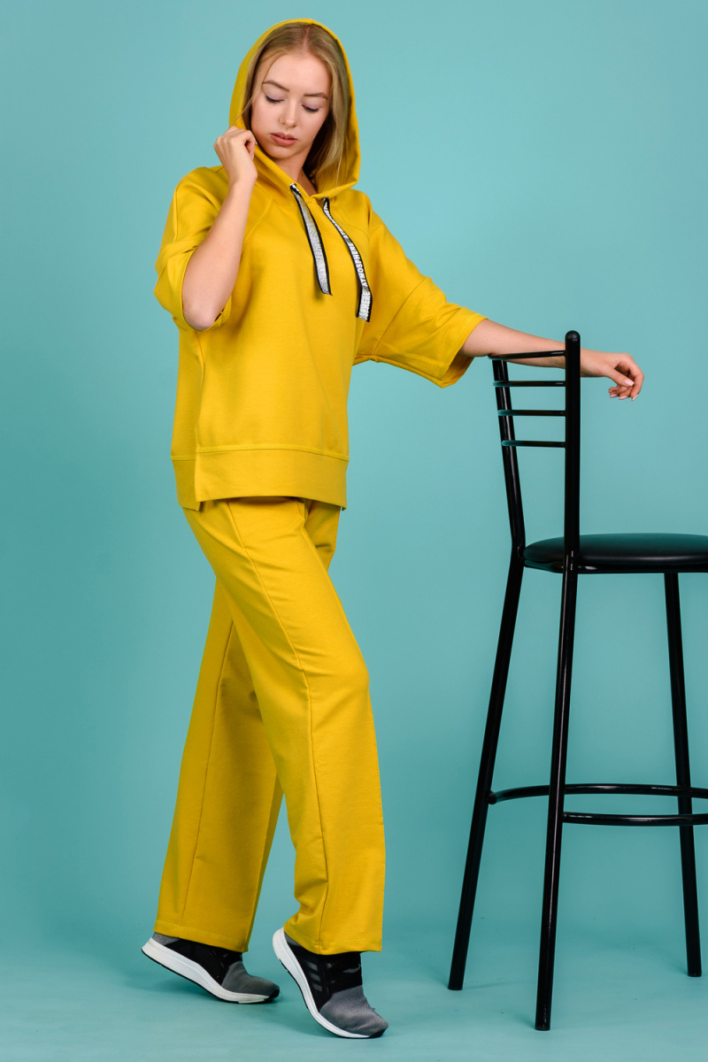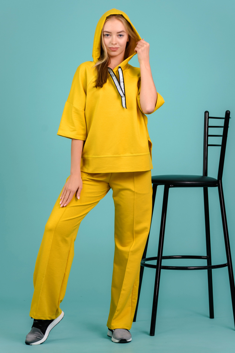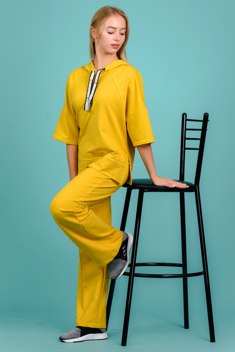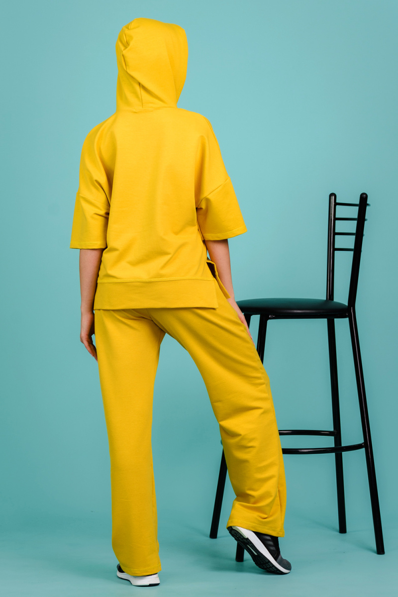 Костюм состоит из толстовки и брюк. Толстовка прямая, свободная, с капюшоном, с коротким рукавом. На полочке расположены симметричные фигурные кокетки. В нижней части боковых швов обработаны разрезы. Низ полочки и спинки завершены поясом. Брюки свободные, прямые, со стрелками, с карманами, на поясе.