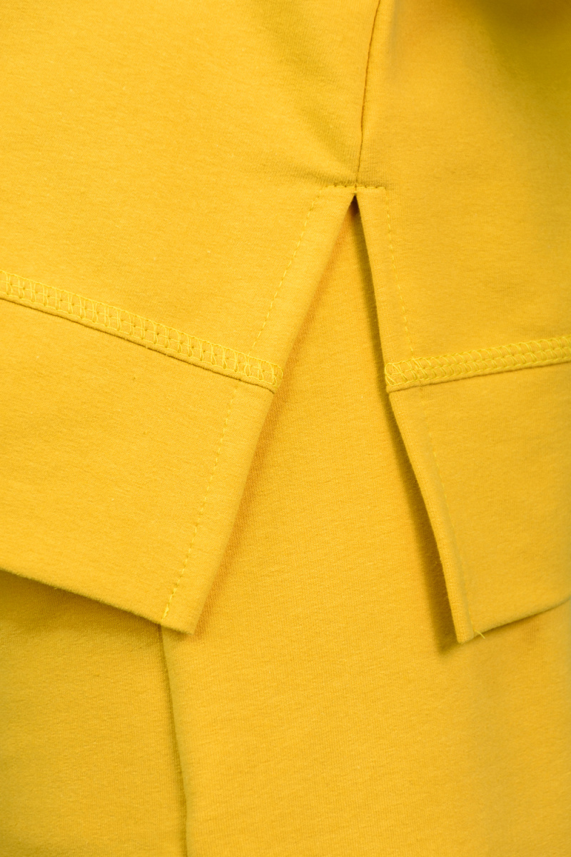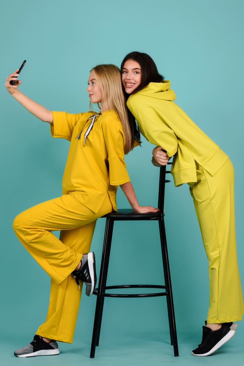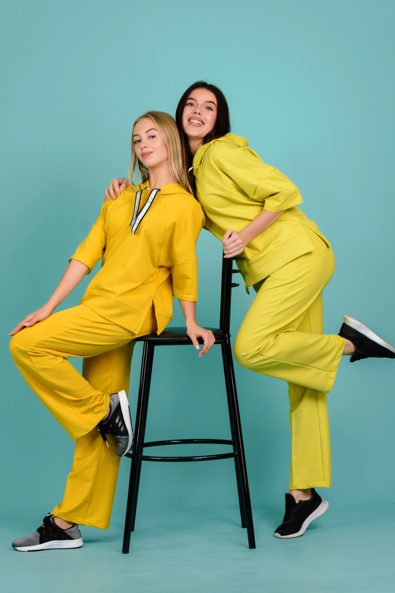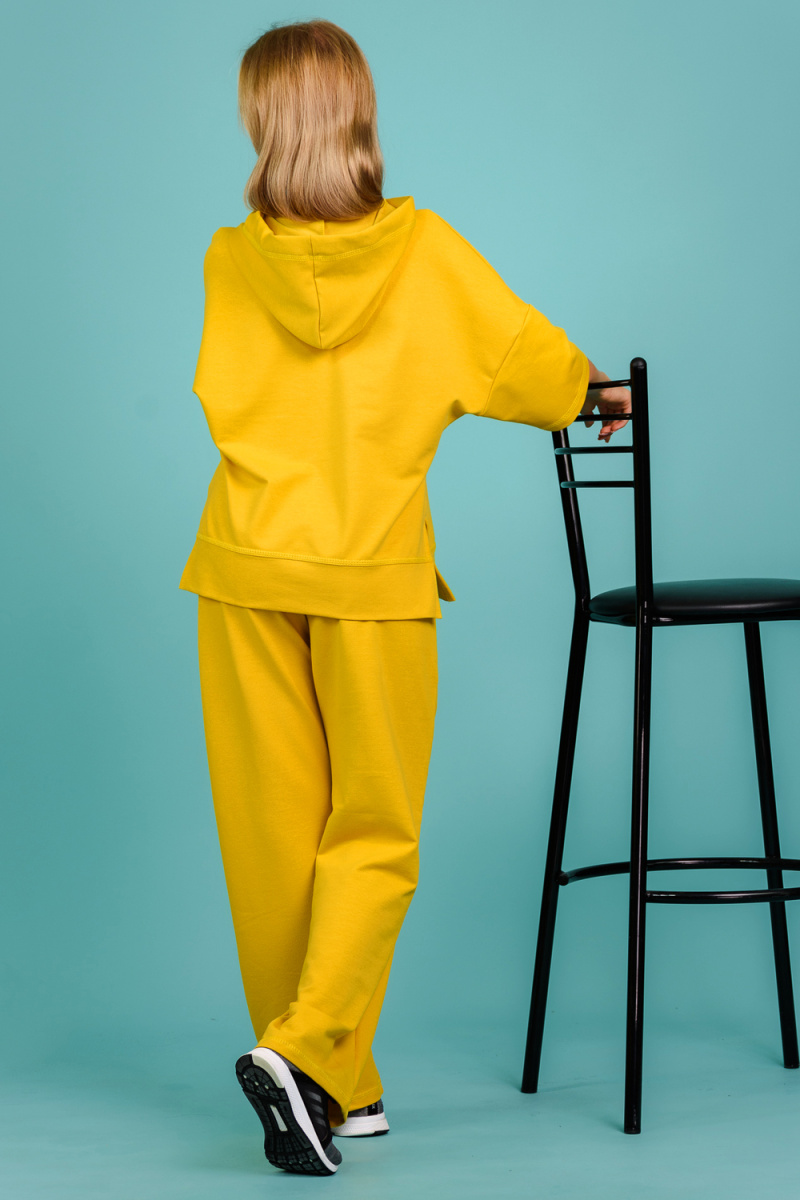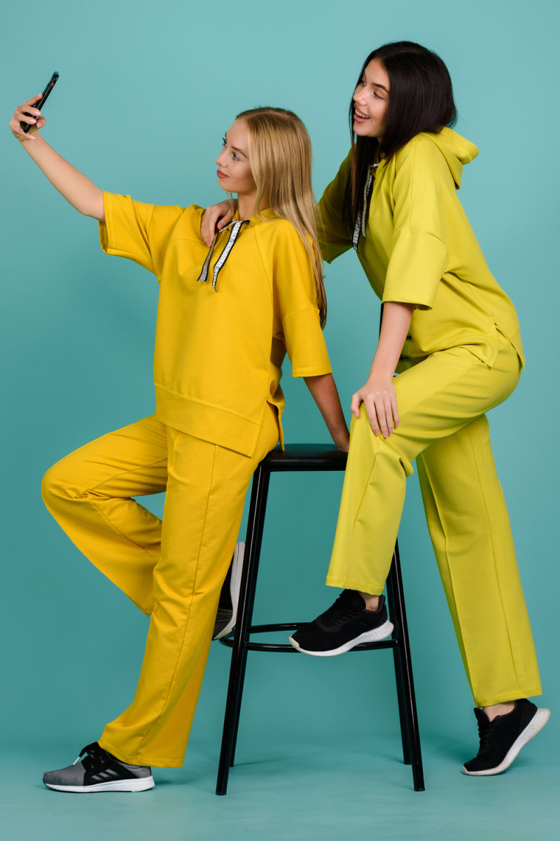 Костюм состоит из толстовки и брюк. Толстовка прямая, свободная, с капюшоном, с коротким рукавом. На полочке расположены симметричные фигурные кокетки. В нижней части боковых швов обработаны разрезы. Низ полочки и спинки завершены поясом. Брюки свободные, прямые, со стрелками, с карманами, на поясе.