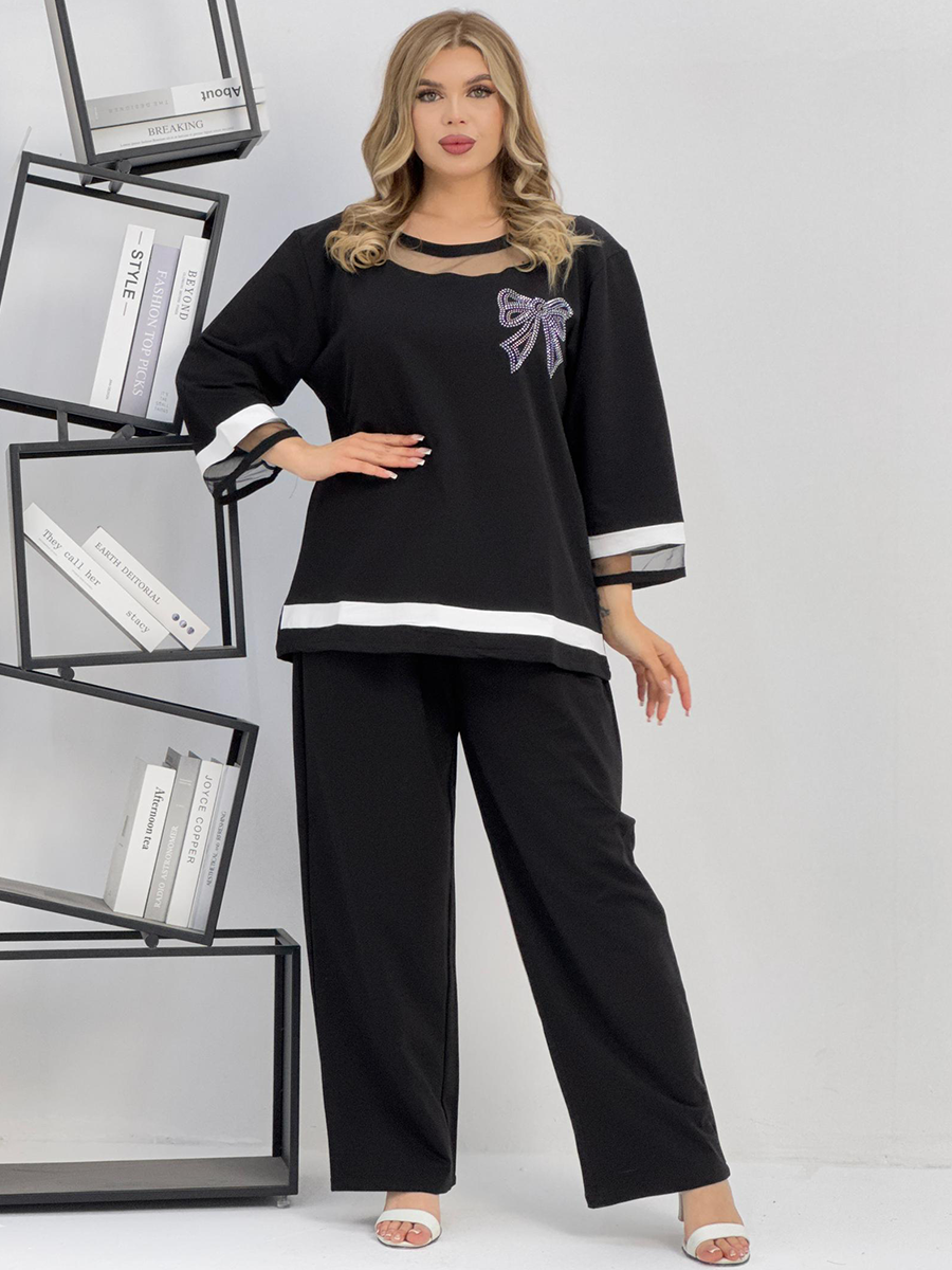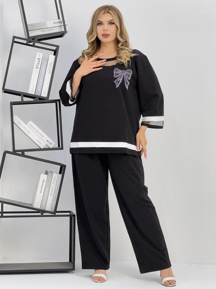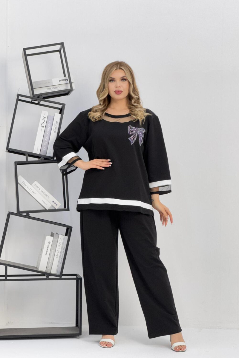 Женский брючный костюм из супрем отличается оригинальным дизайном.