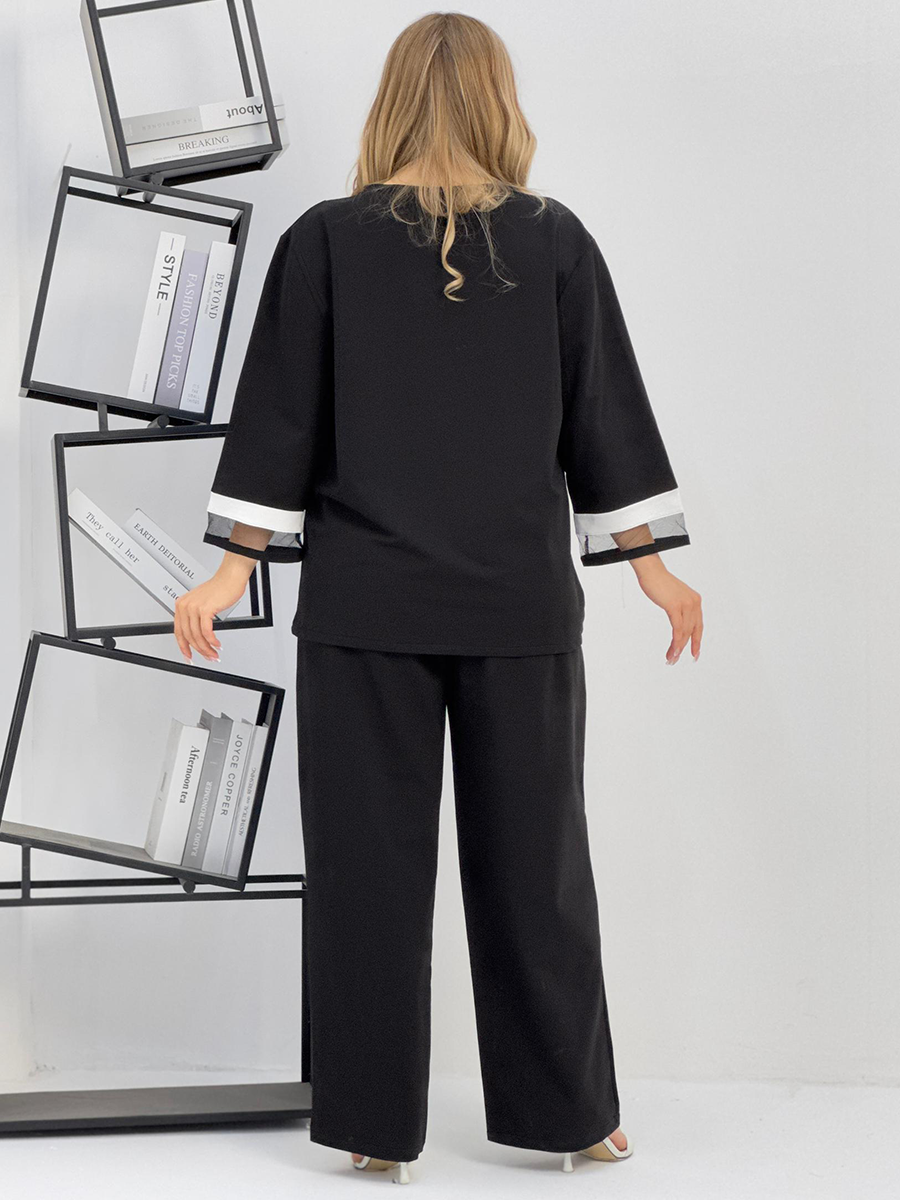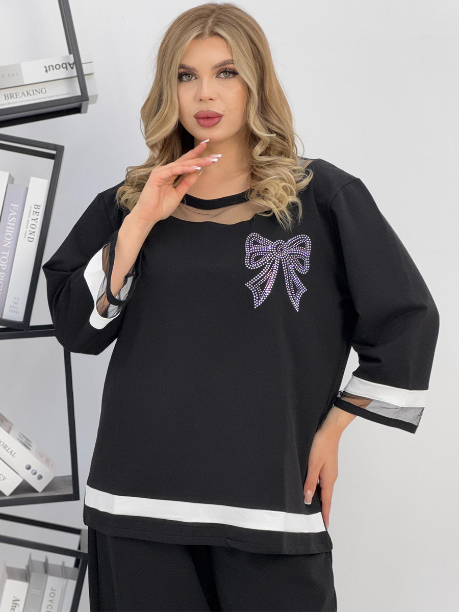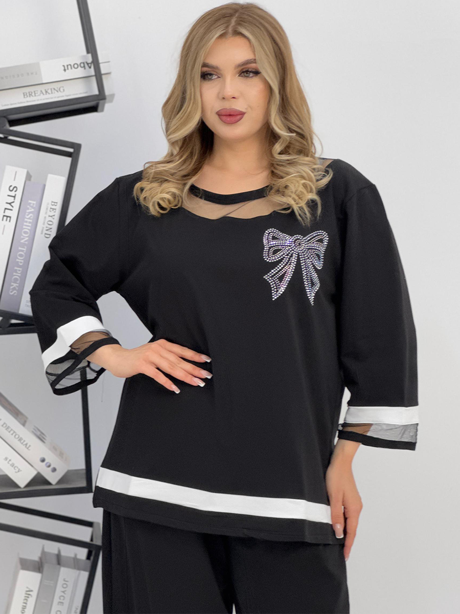 Женский брючный костюм из супрем отличается оригинальным дизайном.